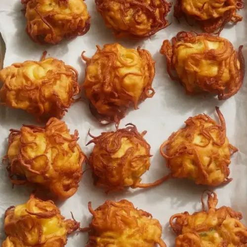 It’s all about a thick, scoopable batter that hugs the onions. A bit of sugar boosts the onion sweetness, and a small amount of baking powder helps the fritters puff just enough. Keep the oil hot but not raging, and you’ll get consistently crisp results.