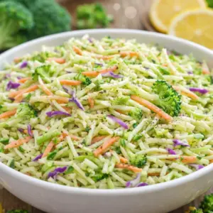 BROCCOLI SLAW is the answer for those days when you want something fresh and crunchy, but you do not want to babysit a pot on the stove. I started making it after showing up to one too many summer get togethers with a sad bag of chips and zero plan. This is the kind of salad that feels like you tried, even if you made it in five minutes flat. It is bright, a little sweet, a little tangy, and it stays crisp for hours. If you have ever dealt with a soggy salad situation, you are going to love this one.