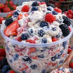 A refreshing no-bake dessert salad featuring a creamy cheesecake filling paired with a variety of juicy summer berries, perfect for hot afternoons and gatherings.