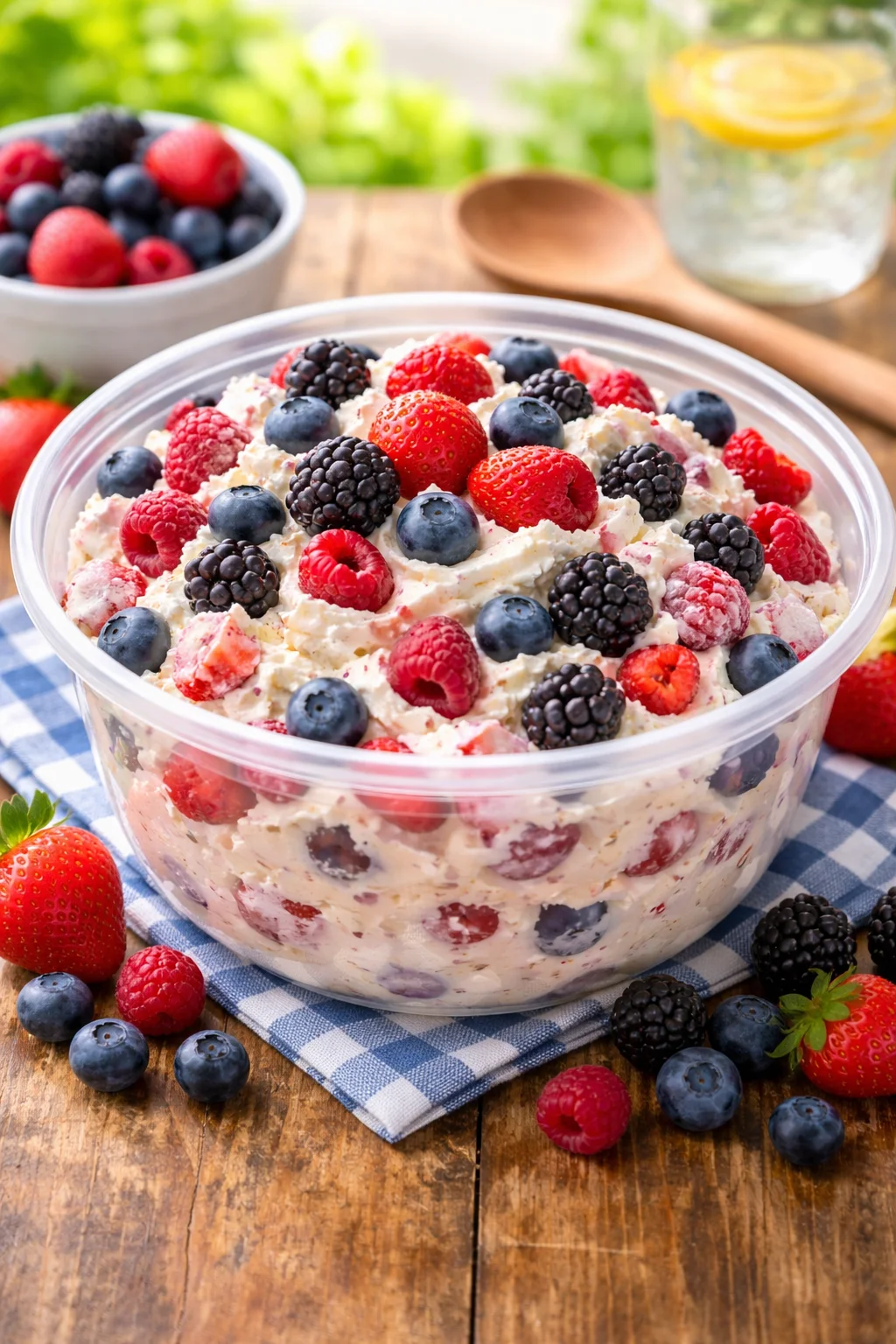 My real life note: berries can release juice as they sit. It is not “bad,” it just changes the look. If you want it picture perfect, keep the berries separate until about 30 to 60 minutes before serving, then gently fold them in.