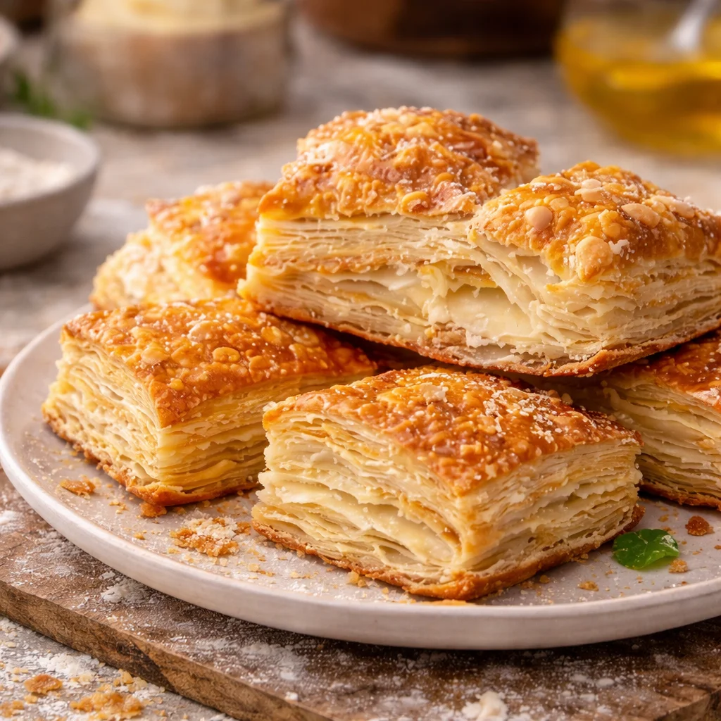 Classic Homemade Puff Pastry recipe showing flaky layers of dough and butter.