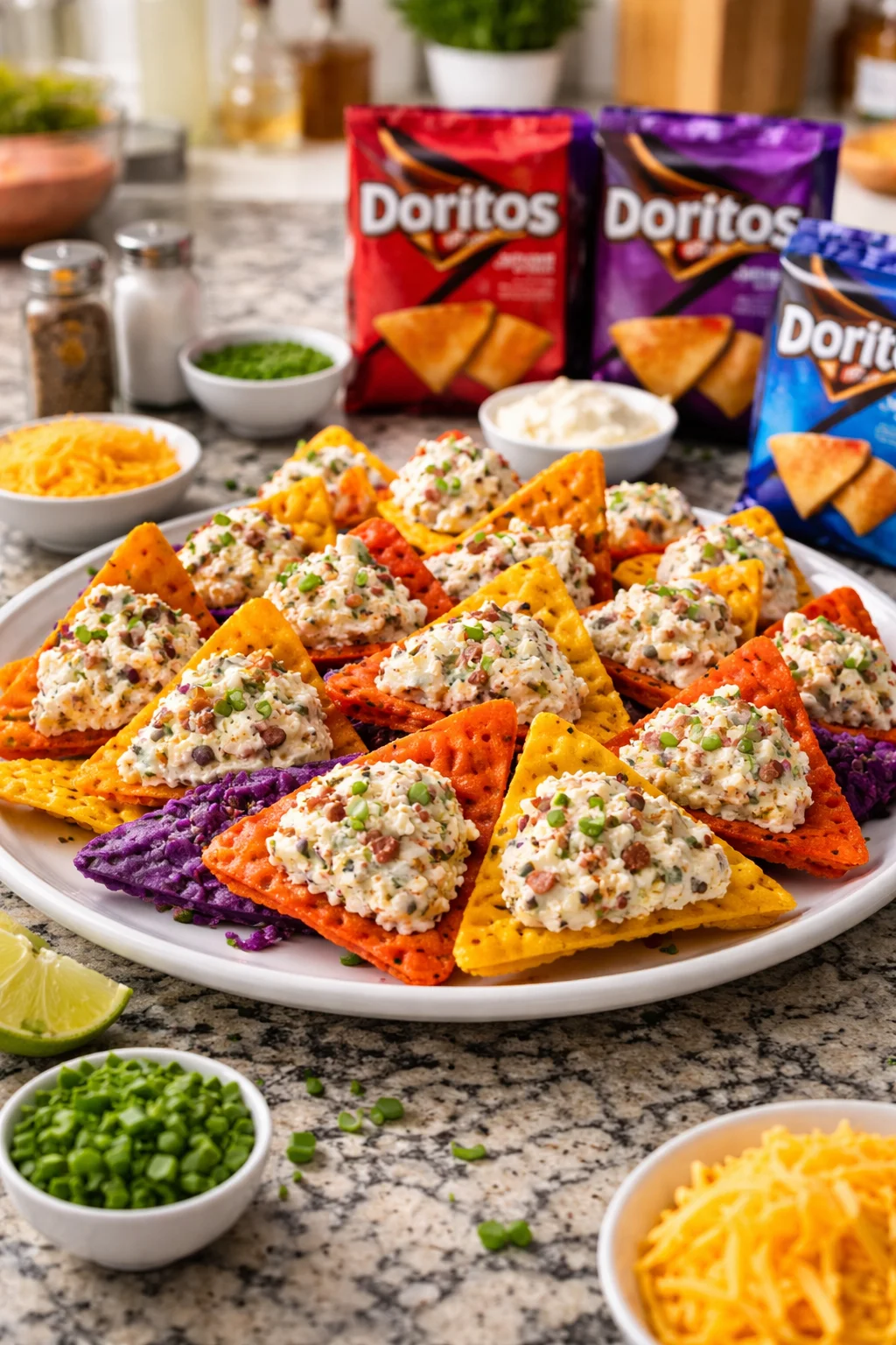 A fun and easy snack combining creamy filling and crunchy Doritos, perfect for game nights or parties.