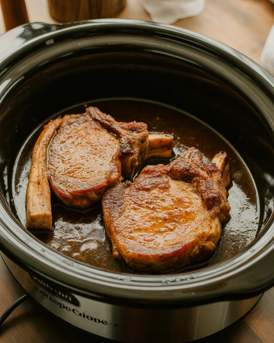 Do I have to brown the pork first? Nope, but I recommend it. Searing builds flavor and helps the chops hold together in the slow cooker.