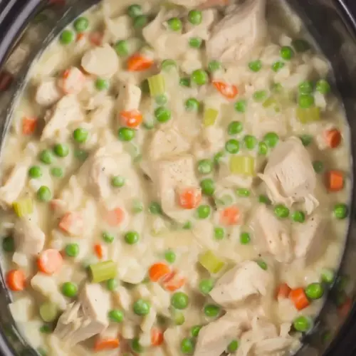 When the chicken is just about cooked through, shred or chop it right in the crock. Stir in rinsed long grain white rice and a splash more broth if it looks thick. You want enough liquid to hydrate the rice without drowning it. Add frozen peas and carrots for an easy veggie boost, then cover and continue on LOW for 45 to 75 minutes. Stir once halfway if your cooker tends to have hot spots. The casserole is ready when the rice is tender and the mixture is creamy. Season to taste, then finish with a handful of shredded cheddar if you like it extra cozy.