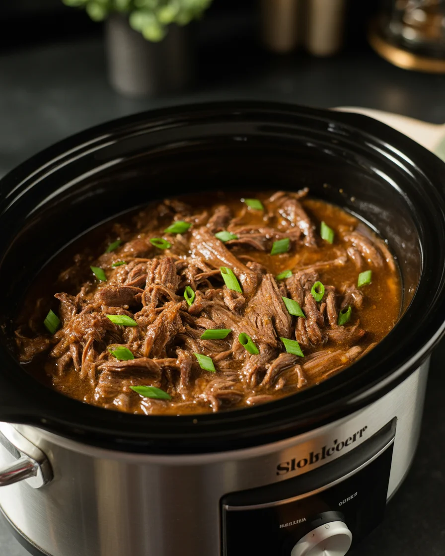- Shred or slice the beef in the pot. If you want the sauce thicker, stir in the cornstarch slurry and cook on High 10 to 15 minutes until glossy.