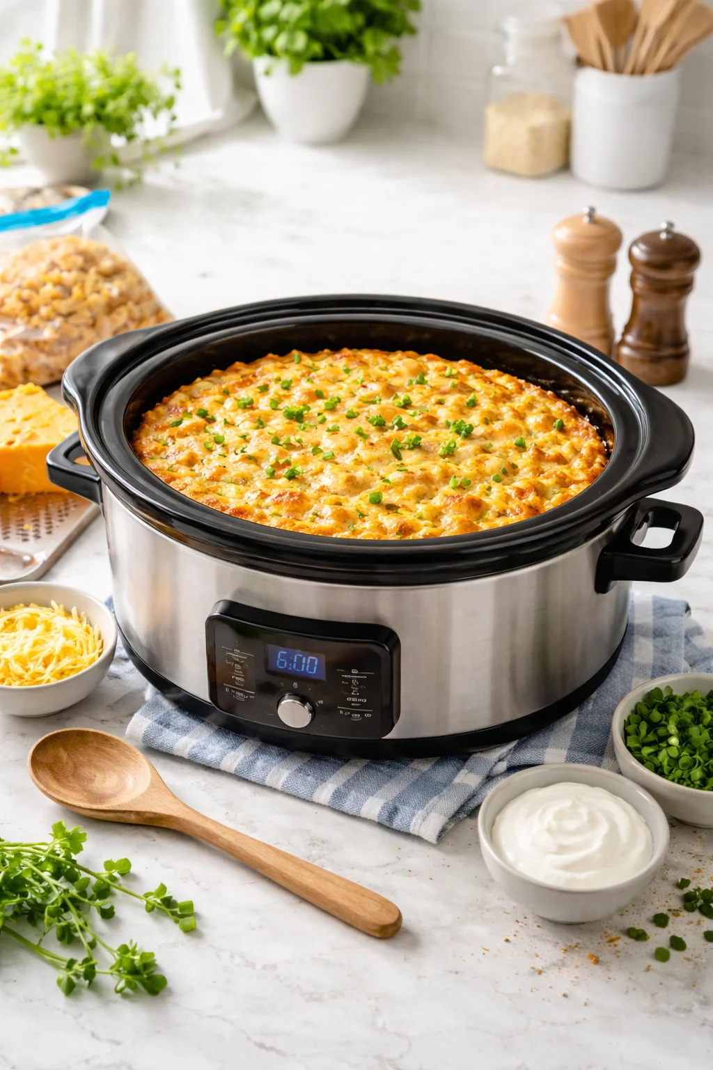 I spray the crockpot insert well, then stir everything together in a big bowl until the potatoes are fully coated. Pour it into the crockpot, smooth it out, and cook on low until hot and bubbly and the edges look slightly golden. I usually plan for about 3 to 4 hours on low, but crockpots vary, so start checking a little early if yours runs hot.