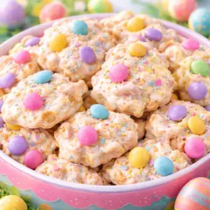 5) Scoop small clusters onto the lined baking sheets. While they are still soft, press a few pastel candies or mini eggs on top and add sprinkles if you want.