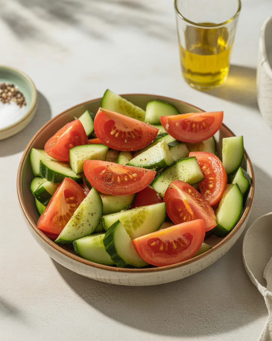 A crisp, colorful salad that combines juicy tomatoes, snappy cucumbers, and a clean vinaigrette, perfect for summer meals.