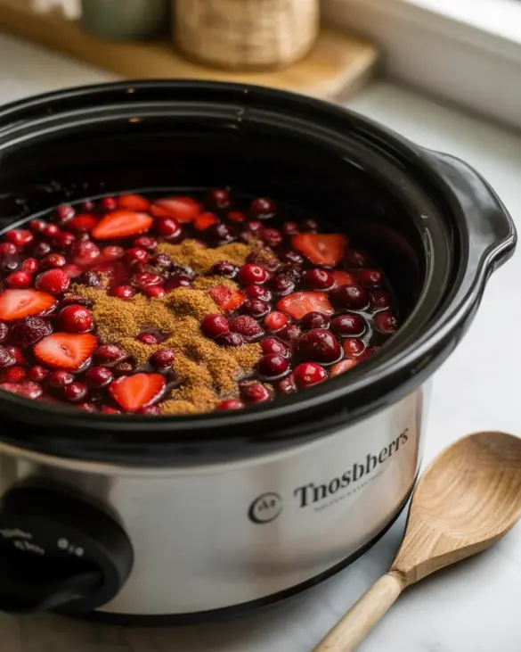 - Load the slow cooker: Add cranberries, strawberries or raspberries, apples, orange zest and juice, sugar, lemon juice, cinnamon, cloves, nutmeg, and a pinch of salt. Stir to coat.