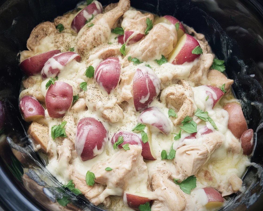A ridiculously easy slow cooker recipe combining tender chicken, bite-sized potatoes, and a garlic Parmesan sauce that fills your home with an irresistible aroma.