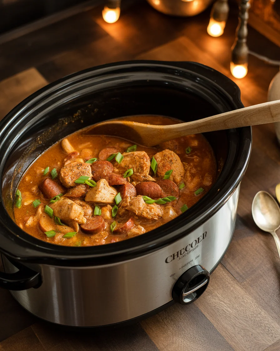 Toss in garlic, diced tomatoes, a hit of Creole seasoning (Tony Chachere’s or make your own), and a little chicken broth. Maybe a bay leaf if you’re feeling fancy. Lid on. Hit start. Turn it on low if you’ve got time, high if you’re in a hurry.