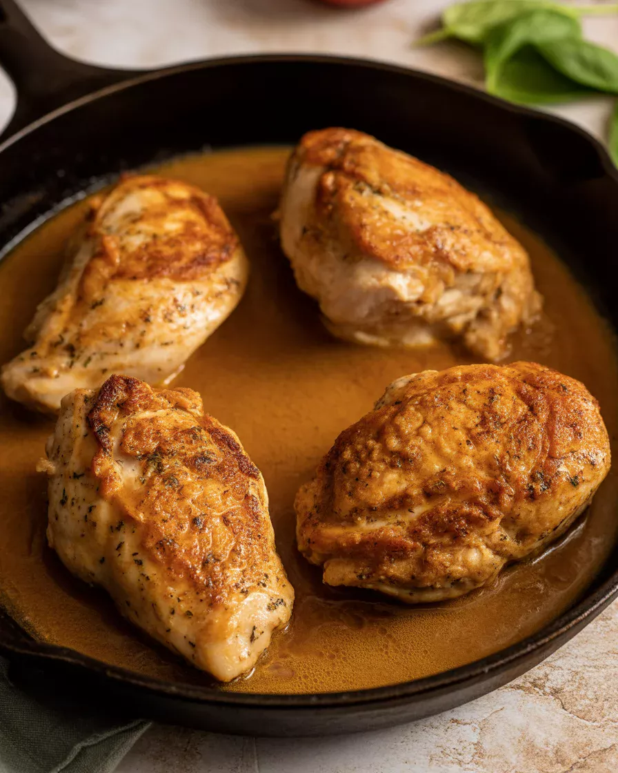 Season and sear: Pat the chicken dry, then season both sides with salt and pepper. Heat olive oil in a large skillet over medium-high. Sear the chicken until golden on both sides and cooked through, about 3 to 4 minutes per side. Transfer to a plate.