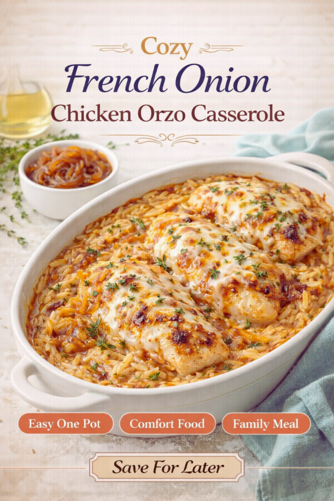 My final verdict: the Deliciously Cozy French Onion Chicken Orzo Casserole is a keeper. Simple, repeatable, and impressive enough for guests without adding stress to your day.