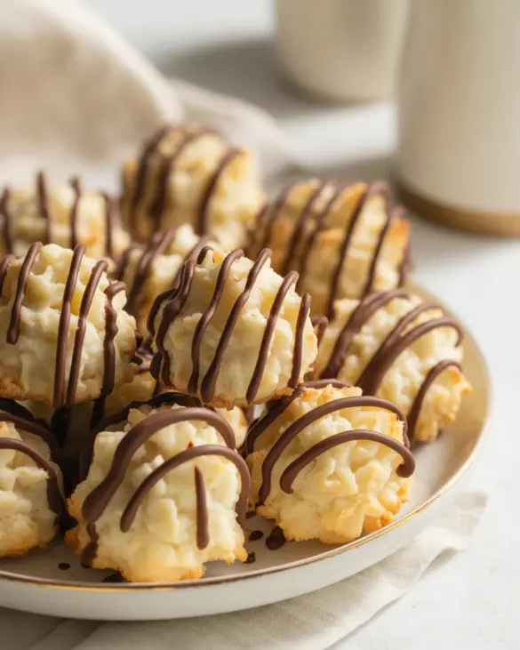 Let’s clear this up first because names can be confusing. Coconut macaroons are chewy coconut cookies made with shredded coconut, egg whites, sugar, and a pinch of salt. They’re often dipped or drizzled in chocolate, though they’re fantastic plain too. They are not the same as French macarons, which are delicate almond sandwich cookies. Macaroons are rustic, golden at the edges, and deeply coconutty.