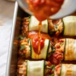 - Roll the zucchini around the filling and place seam side down in a baking dish with a splash of sauce at the bottom.