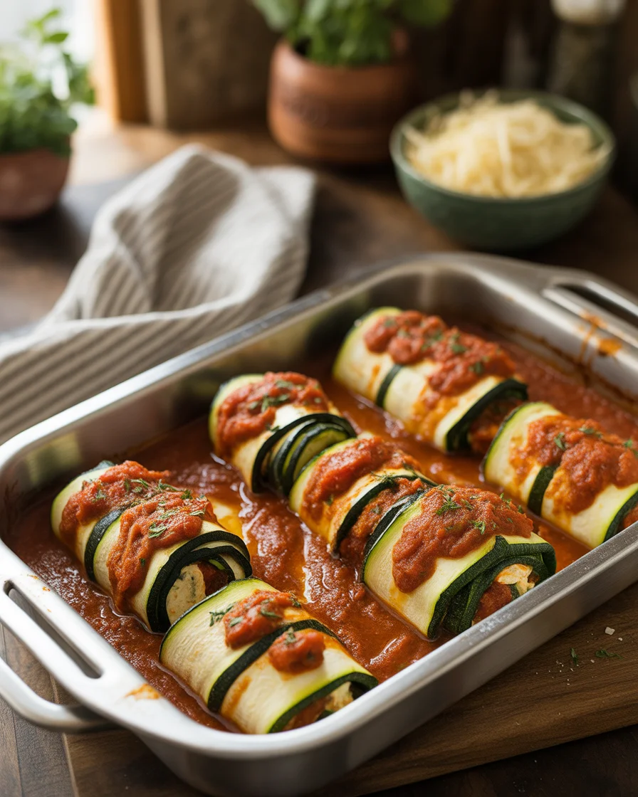 - Roll the zucchini around the filling and place seam side down in a baking dish with a splash of sauce at the bottom.