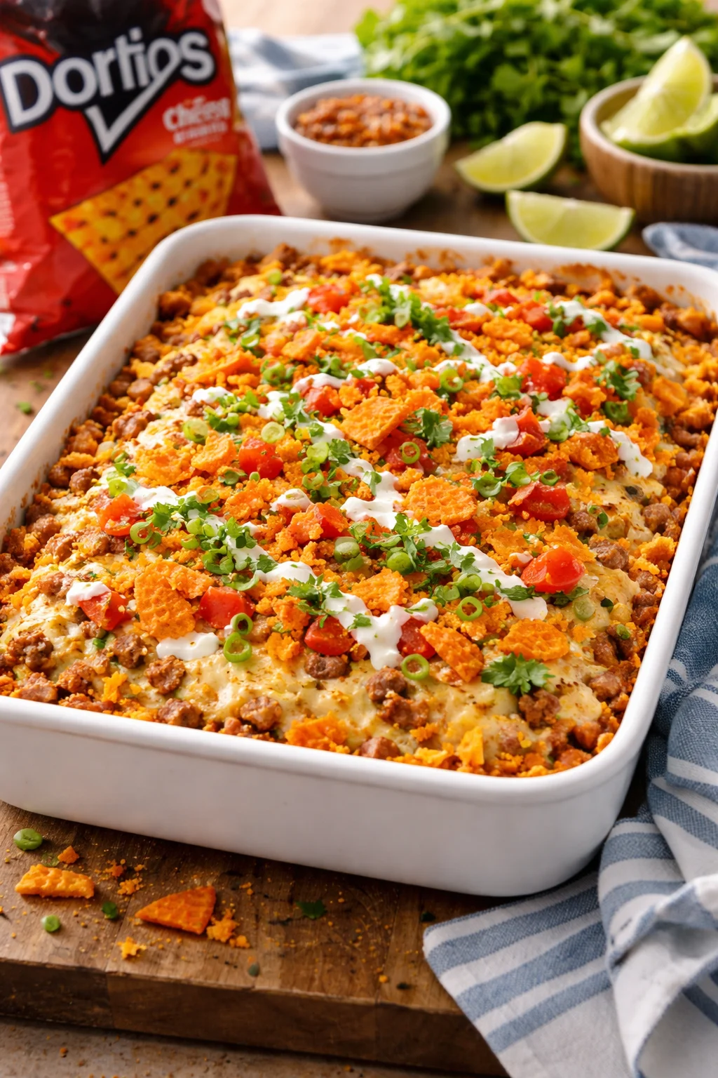 A crunchy, cheesy, and slightly spicy casserole that combines the flavors of taco night with the fun crunch of Doritos. Perfect for busy nights and feeding a crowd.