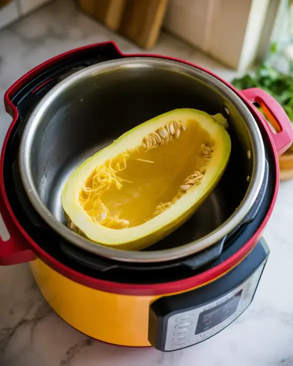 Before cooking, rub the cut sides with a little olive oil, a pinch of salt, and garlic powder. After cooking, toss the strands with butter, Parmesan, and cracked pepper, or swirl in marinara and basil. If you want a classic red sauce moment, try this quick weeknight favorite: Instant Pot spaghetti with meat sauce. It’s hearty and pairs beautifully with delicate squash strands.