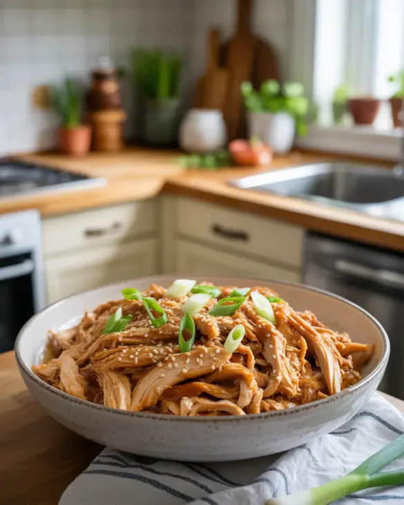 For the sauce, I like mixing up soy sauce, honey, garlic, ginger, and a splash of rice vinegar. Smells so good! Set the crock pot on low for 4-5 hours – not all day, or you might risk dry chicken. Easy peasy. Toward the end, shred the chicken in the sauce with two forks. If you want it thicker, mix a little cornstarch with water and stir it in for the last 30 minutes. Feels like you’re eating at some five-star restaurant. Or, at least, a pretty decent takeout place.