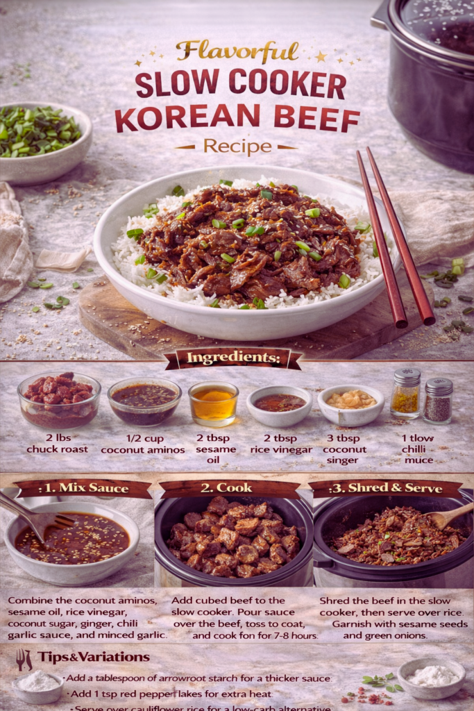 Flavorful Slow Cooker Korean Beef Recipe is flexible. Add sliced onions or carrots in the last 2-3 hours for extra texture, or toss in a handful of spinach for the final 10 minutes for color and freshness.