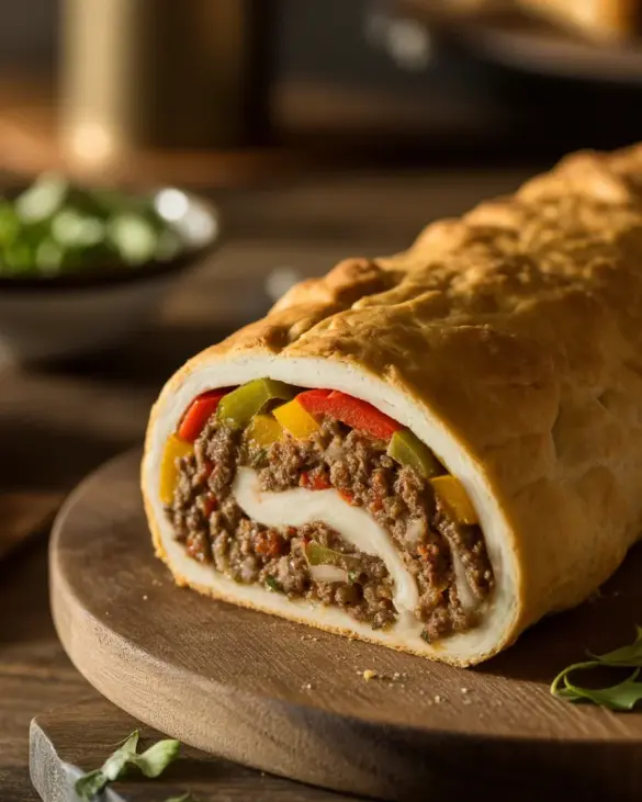 I’ve made a cheeseburger version so many times I could do it with my eyes closed. Brown beef, a little ketchup and mustard for classic burger flavor, sautéed onions, pickles chopped tiny, and a generous handful of cheddar. When it bakes, the top goes glossy and golden. The middle stays gooey in the best way. Slicing reveals that cross section of beef and cheese that gets everyone excited.