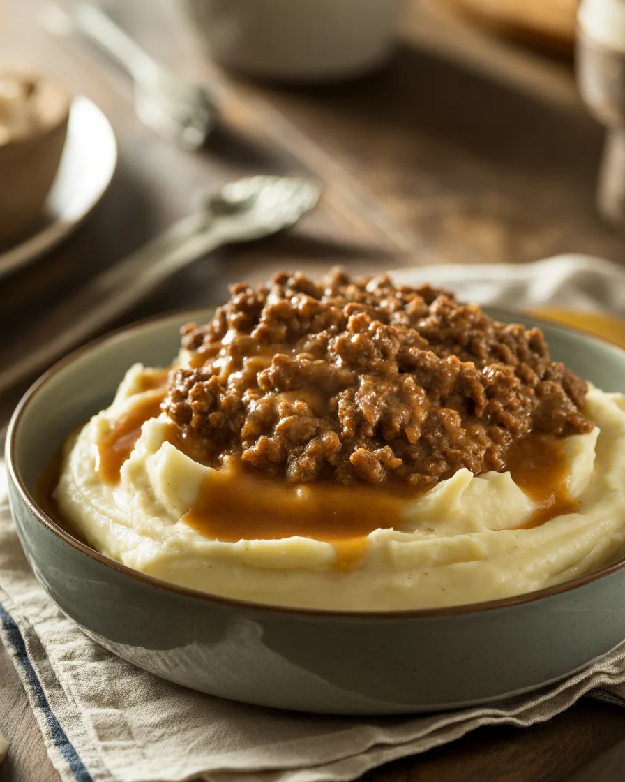 This is real deal comfort cooking: simple ingredients, big flavor, and a bowl that makes everyone happy. GROUND BEEF & GRAVY OVER MASHED POTATOES proves you don’t need a long ingredient list to make a meal that feels special. If you want to explore other takes, these guides are helpful and trustworthy: Ground Beef and Gravy Over Mashed Potatoes – 40 Aprons and Ground Beef and Gravy Over Mashed Potatoes – That Oven Feelin. Now go grab that skillet, get your potatoes fluffy, and enjoy the kind of dinner that makes a long day feel a little lighter.