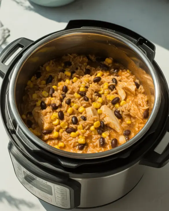 First, rinse the rice until the water runs clear. This helps it cook fluffy, not sticky. Add the rice to the pot with broth, then stir in the spices and salsa. Layer the chicken right on top. Do not stir. That layering helps the rice cook evenly and keeps the burn warning away. Seal the lid, set to high pressure for a short cook, then let it naturally release for a bit before you quick release the rest. Shred the chicken right in the pot, fluff the rice, and serve it up with your toppings. So easy and so good.
