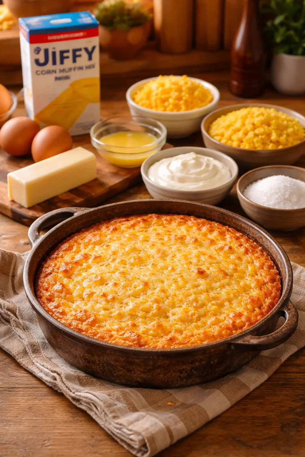 Most versions use a box of Jiffy corn muffin mix as the shortcut. That mix gives you a reliable base, a little sweetness, and that familiar corn flavor. The rest is just a few simple ingredients that make it rich and creamy.