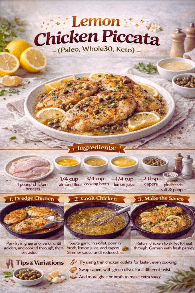 Traditionally, piccata sauce uses butter and flour. We’re keeping the soul of the dish, but making smart swaps so it stays Paleo, Whole30, and keto friendly without losing that signature shine.
