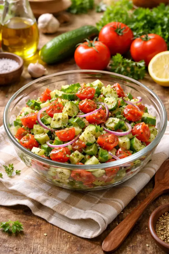 I have made this salad so many times that I can almost do it on autopilot, but there are a few small things that make a big difference. The goal is **crunchy cucumbers**, **sweet tomatoes**, and **onion flavor** that does not bulldoze everything else.