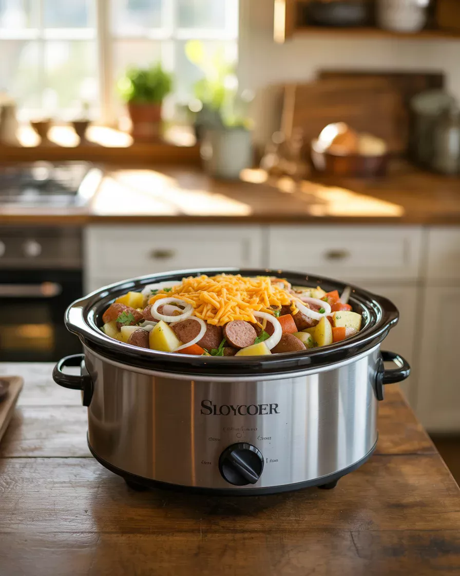 - Layer: Add half the potatoes, half the onions, and half the sausage to the slow cooker. Pour in half the sauce. Repeat the layers, then finish with the remaining cheese on top.