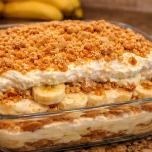 First, whisk the instant pudding mix with cold milk until it thickens. Fold in the whipped topping gently so it stays fluffy. If you are adding peanut butter, whisk it into the pudding before you fold in the whipped topping. Then start layering: cookies, bananas, pudding mixture. Repeat until you run out, and finish with extra cookies on top.