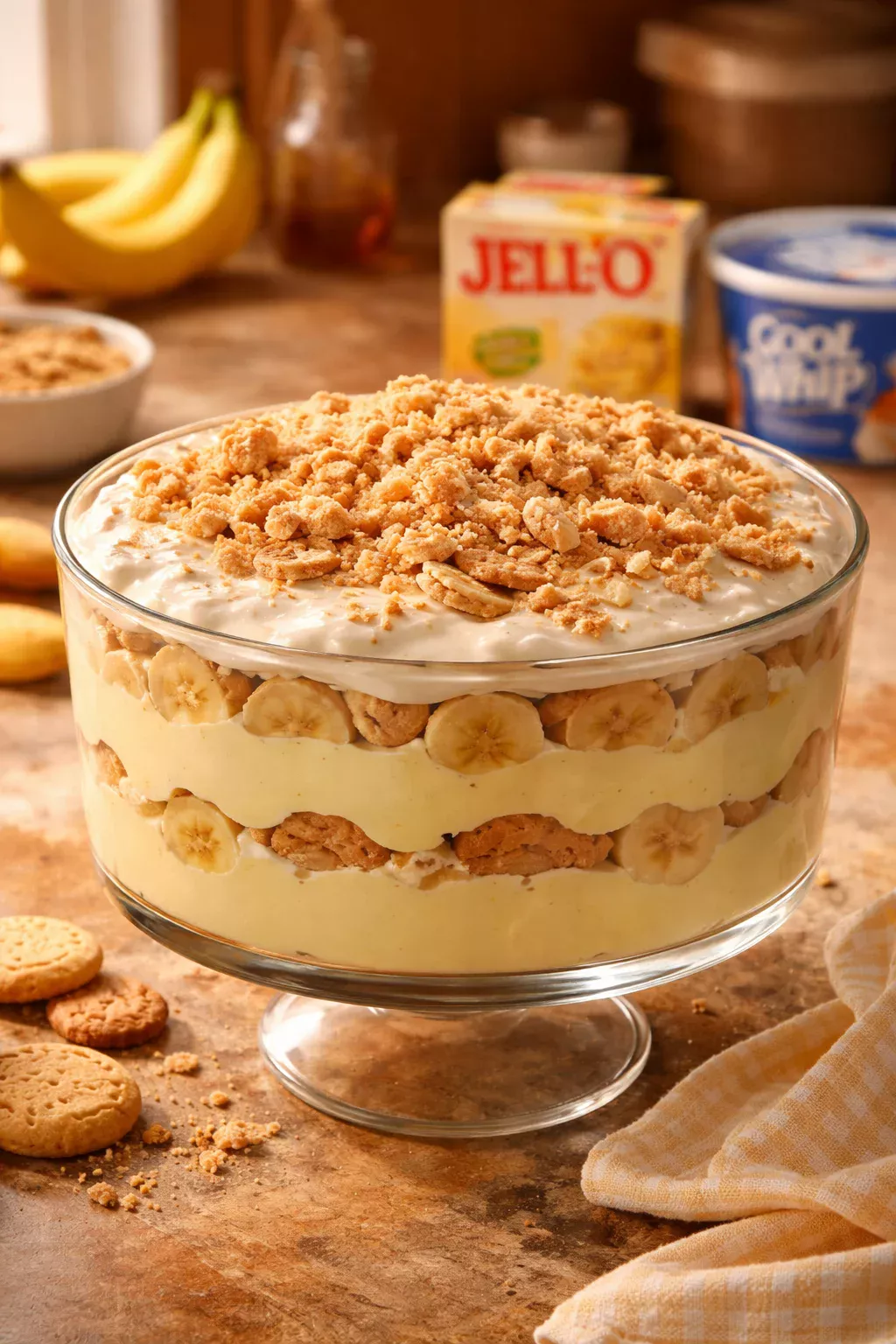This is the version I make the most because it is simple, forgiving, and it tastes even better after it chills. I like to build it in a big glass bowl so you can see those layers, but a 9 by 13 dish works too. And yes, it is totally fine to use boxed pudding mix here. I do it all the time, and it still tastes homemade once you add the cookies, bananas, and whipped topping.