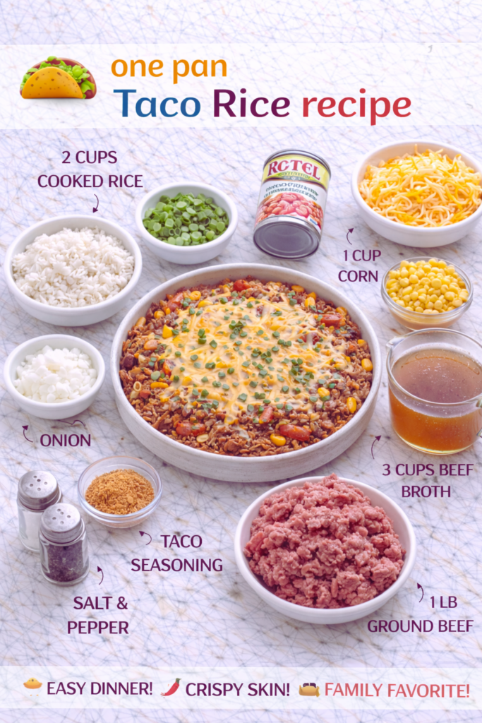 This recipe is my base model. Once you’ve got the rhythm down, tweak it to match your cravings or what’s in your pantry. A flexible one pan Taco Rice recipe is gold on busy nights.