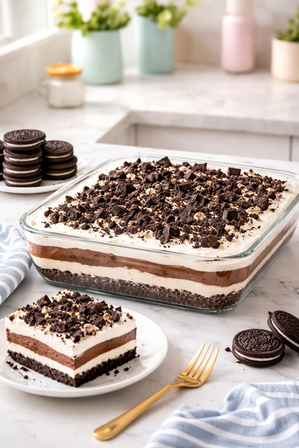 Pause before slicing until it is fully chilled. Warm, rushed Oreo lasagna tends to slide around.