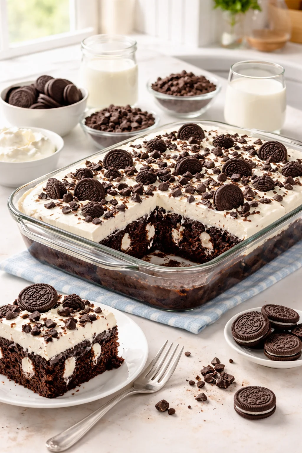 Chill time is not optional. I mean, you can eat it sooner, but the flavor and texture are way better after a few hours. This is when the OREO POKE CAKE becomes that creamy, sliceable, perfect party dessert.