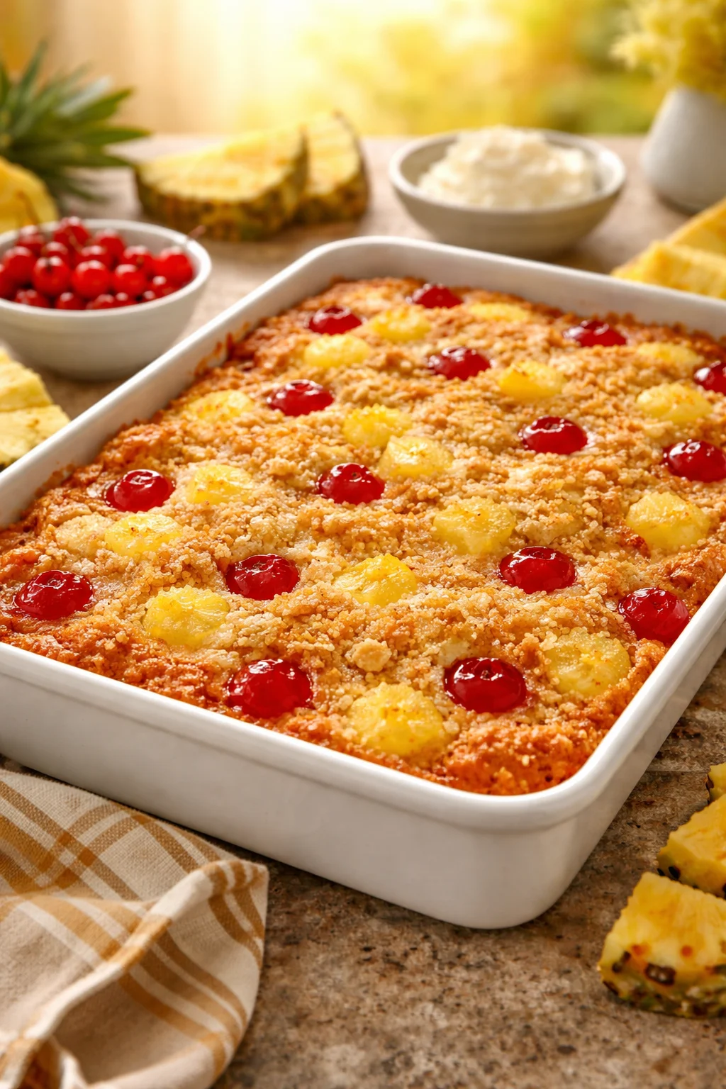 With Pineapple Dump Cake, the whole idea is that the fruit and its juices create the base, the dry cake mix becomes the topping, and the butter melts through it all while baking. The oven does the heavy lifting, and you end up with something that tastes like a cobbler and a cake had a very happy vacation together.