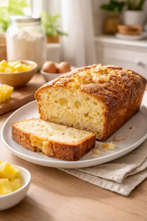 A soft and buttery quick bread dotted with juicy pineapple, perfect for a sweet and cozy treat.