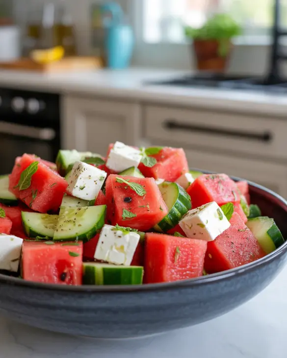 A refreshing and easy-to-make summer salad featuring sweet watermelon, crunchy cucumber, and creamy feta, topped with fresh mint and a zesty lime dressing.
