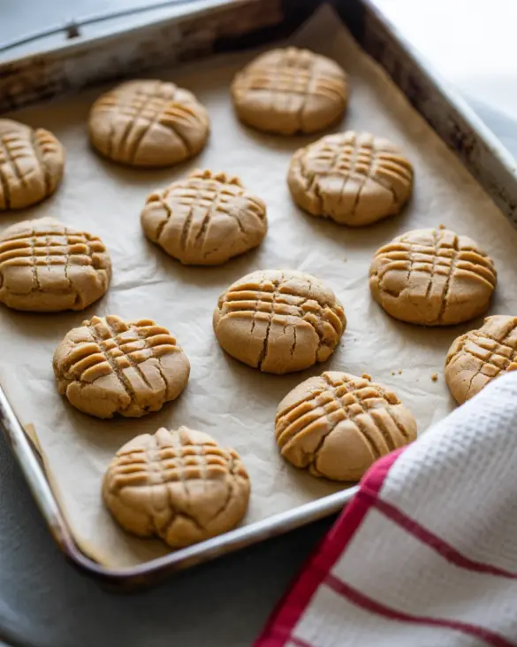 Now grab a baking sheet and line it with parchment. Scoop little blobs of dough onto the sheet—think golf ball size, but I rarely measure. Flatten them with a fork, criss-cross style (the classic peanut butter cookie look). Bake at 350°F for about 9 to 11 minutes. I always check them by minute 9 so they don’t turn into rocks. The bottoms will look a tiny bit golden and the tops might still look soft. That’s good.