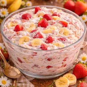 If you need a no stress dessert that still feels special, STRAWBERRY BANANA CHEESECAKE SALAD is the one I keep coming back to. It is quick, creamy, and packed with fruit, and it plays nice with potlucks and weeknight cravings. The biggest tip is to keep the crunch separate until the last second and not overmix the fruit. If you want to see another take on it, check out Strawberry Banana Cheesecake Salad + Video – TSRI for a visual walk through. And for a slightly different spin, Strawberry Banana Cheesecake Salad – From The Chef To You is also worth a look. Now go grab those strawberries and bananas and make it happen.