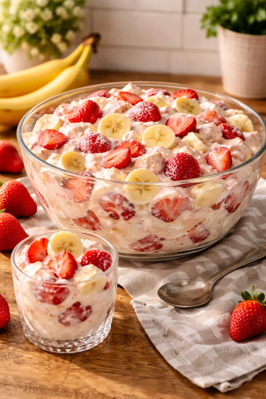 You can, but I recommend prepping in parts. Make the creamy base and slice strawberries ahead. Slice bananas and mix everything together closer to serving so the bananas stay fresh.