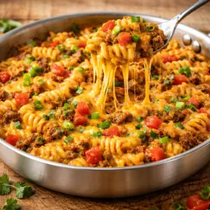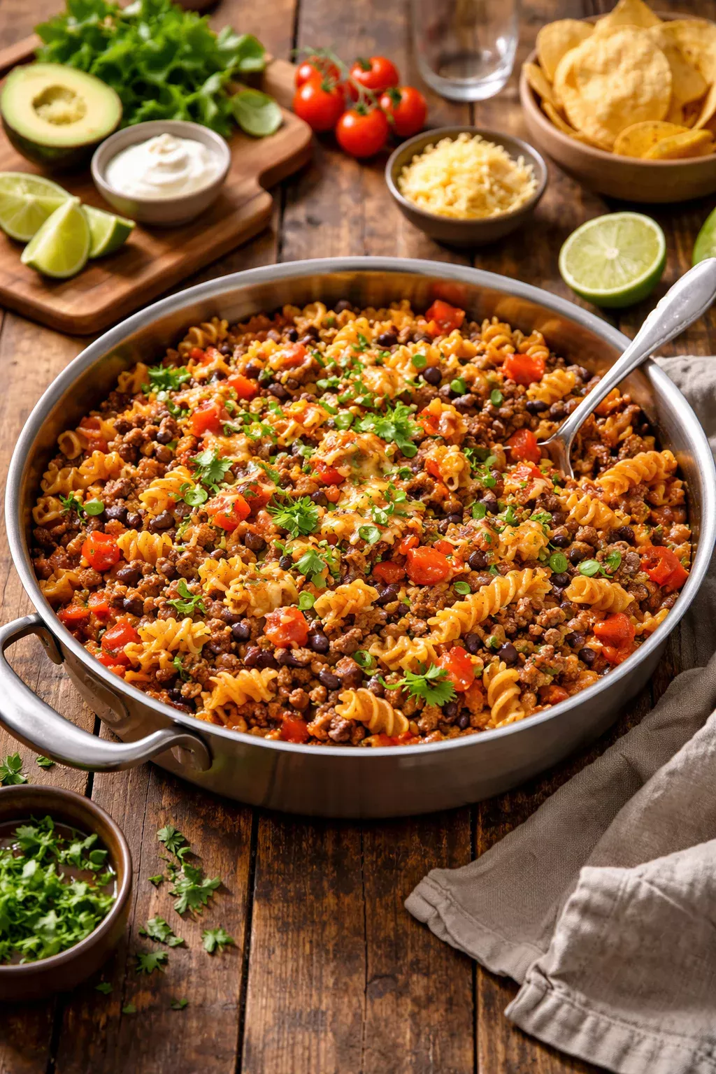 Start by browning the meat with onion in a big pot. Once it is cooked, add garlic for about 30 seconds so it smells amazing. Stir in taco seasoning and tomato sauce, then pour in broth. Add the rotini and stir well so it does not stick. Bring it to a gentle simmer, cover, and cook until the pasta is tender, stirring a couple of times. Turn off the heat and stir in cheese until it melts into a creamy sauce. If you want it extra taco style, top it with crushed tortilla chips right before serving.